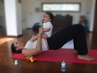 Sırtüstü yatın. Bebeğinizi size bakacak şekilde koltuk altlarından tutarak göğsünüzde tutun. Nefes alırken kollarınızı düzleştirin ve bebeğinizi yukarı doğru kaldırın, nefes verirken bebeğinizi tekrar göğsünüze indirin. Hareketi tekrarlayın ve kol kaslarınızı güçlendirin!