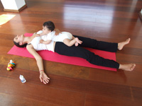 Sırtüstü uzanın, bebeğinizi göğsünüze ya da karnınıza yatırın. Bacaklarınız açık, ayaklarınız gevşek, kollarınız açık, avuçlar yukarı bakıyor… Baş ve boynunuz rahat, yüz kaslarınız gevşek, gözleriniz kapalı olsun…Tüm beden, kaslar, kemikler, eklemler tüm ağırlığıyla yerde, tamamen gevşek…Burnunuzdan derin, yavaş nefesler alıp veriyorsunuz… Her nefes alışınızda, karnınız bir balon gibi şişiyor ve her nefes verişinizde tüm hava karın bölgenizden boşalıyor ve karnınız yavaşca iniyor. Bebeğinizin başını karnınızda, varlığını tüm benliğinizde hissedin. Birlikte rahatlayın, gevşeyin, dinlenin, ‘bir’ olun…