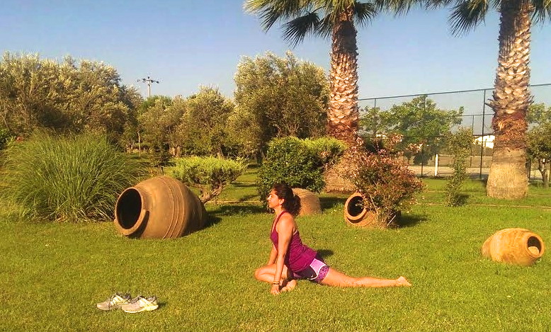 6c: Kertenkele Duruşu’ndan yavaşça çıkarak sol dizinizi yere koyun, bacağınızı çevirerek yan tarafını yere yerleştirin, sol bacağı iyice geriye doğru uzatın. Sol ayak üzeri de yerde olsun. Aynı anda sağ bacağınızın yanını yere yerleştirip, denge için ellerinizden destek alarak sırtınızı dikleştirin.