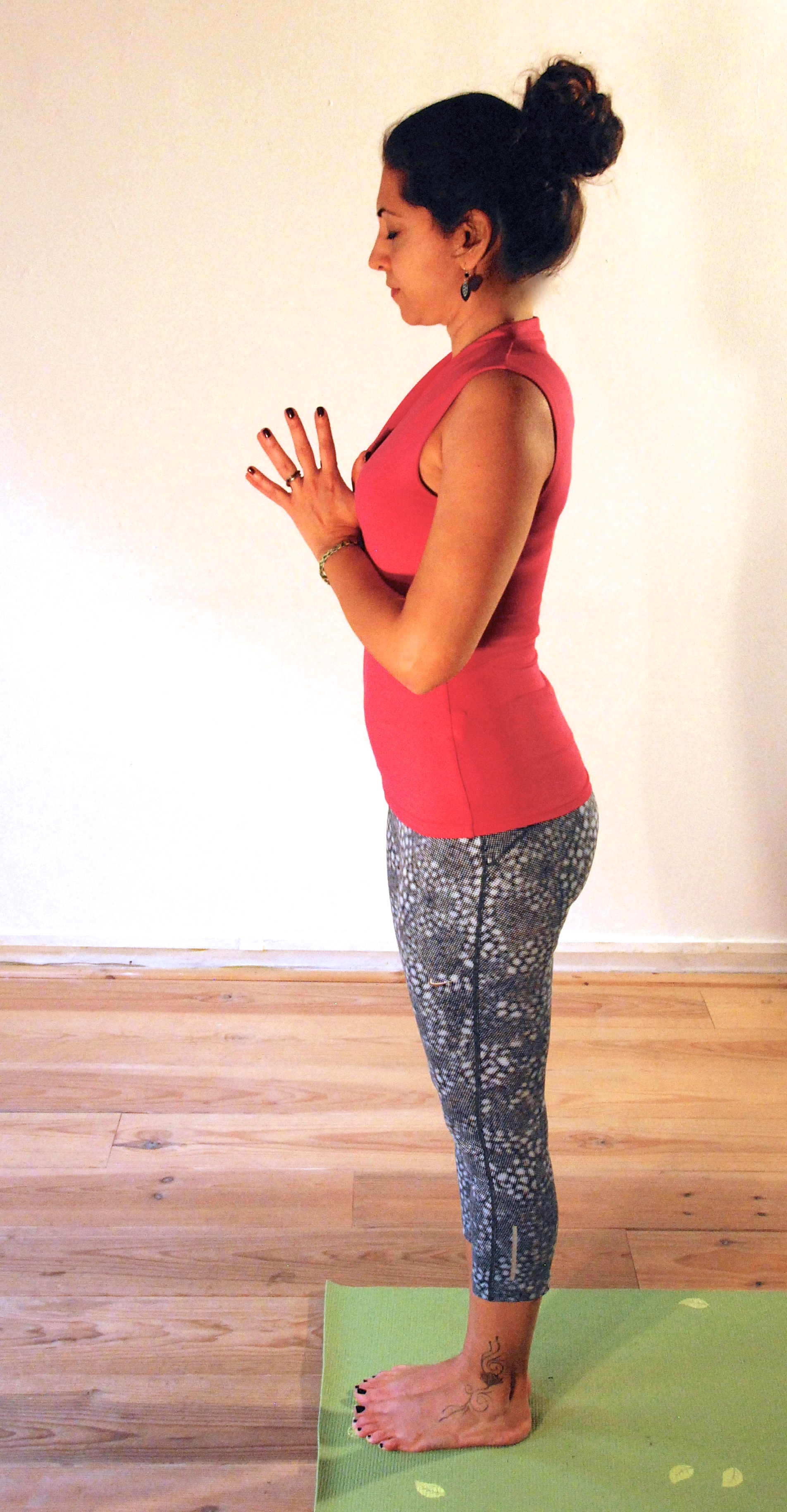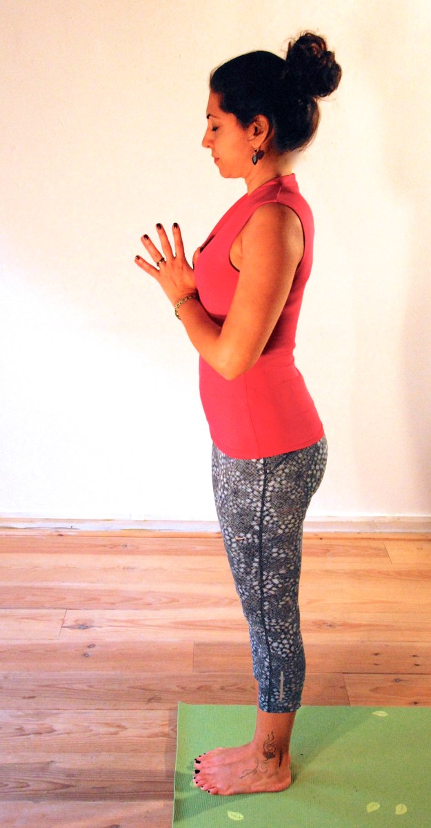 Namaskara Tadasana: Başlangıç ve bitirişte, avuçlarınız birleşik, ellerinizi göğsünüz hizasına getirin. Ayaklarınız birleşik, doğal nefesler alıp vererek merkezinizi bulun.