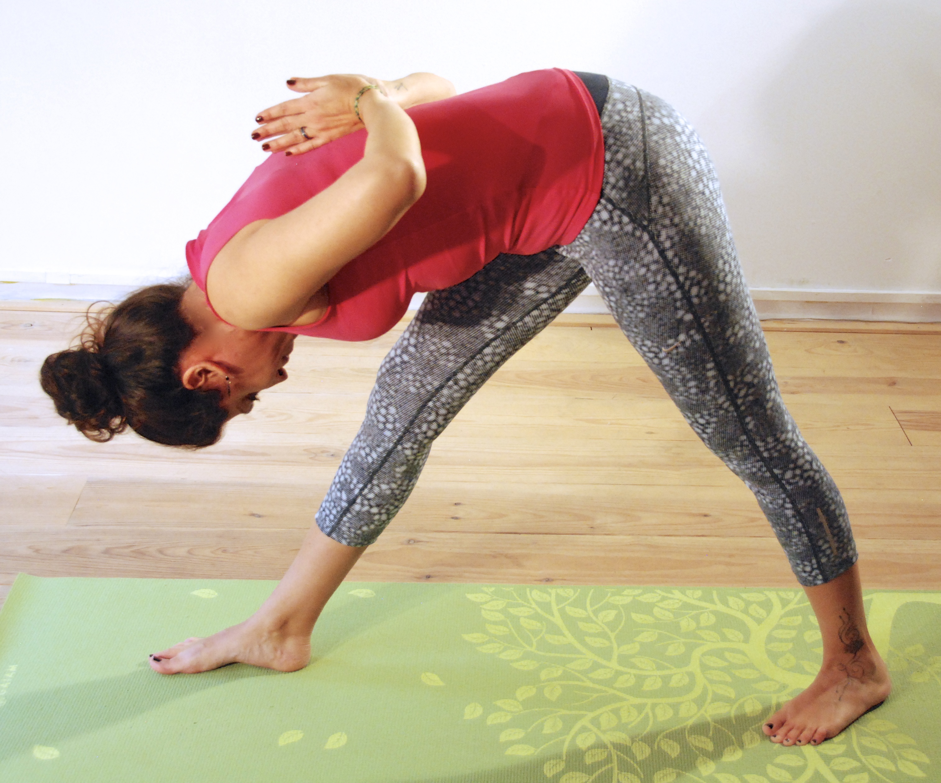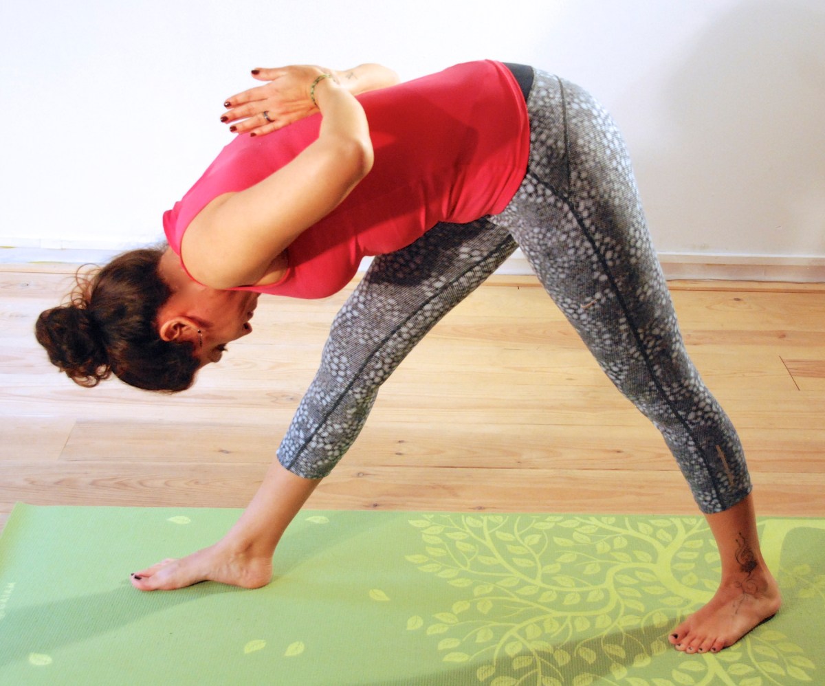 Parsvottanasana: Sağ dizinizi düzleştirerek kalçanızı tekrar matın kısa tarafına çevirin. Avuçlarınızı arkada birleştirin ya da ellerinizle ters dirseklerinizi tutarak nefes alırken göğsünüzü açın, omuzlarınızı arkaya alın. Nefes verirken kalçalardan öne uzayarak ve karın kaslarını da sıkarak öne eğilin. Duruşta bir kaç nefes kalın.